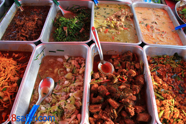 سوپی داغ و شیرین مزه بوده که با مرغ و شیر نارگیل درست می شود. "راد نا"، رشته برنجی به همراه سسی غلیظ و گوشت گاو، مرغ، میگو یا دیگر موجودات دریایی است. "گای پاد خینگ"، مرغ سرخ شده با زنجبیل قطعه قطعه شده است. "کاری قرمز" یا "گائنگ فت" که به معنای کاری بسیار تند است با مقدار بسیار زیادی چیلی قرمز خشک شده طبخ می شود.